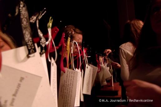 Verses on individual cards hang on the stage while students are invited to come and take a verse for themselves. Photo by Maddie Binning.