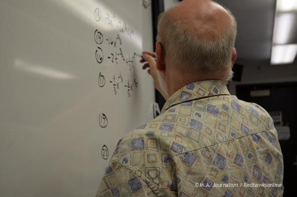 AP Calculus teacher Rich Enderton puts homework answers on the board. Photo by Maddie Binning.