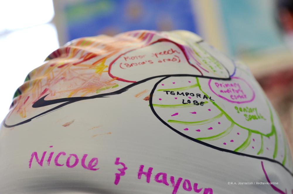 Anatomy students create caps to show the different parts of the brain. Photo by Maddie Binning.