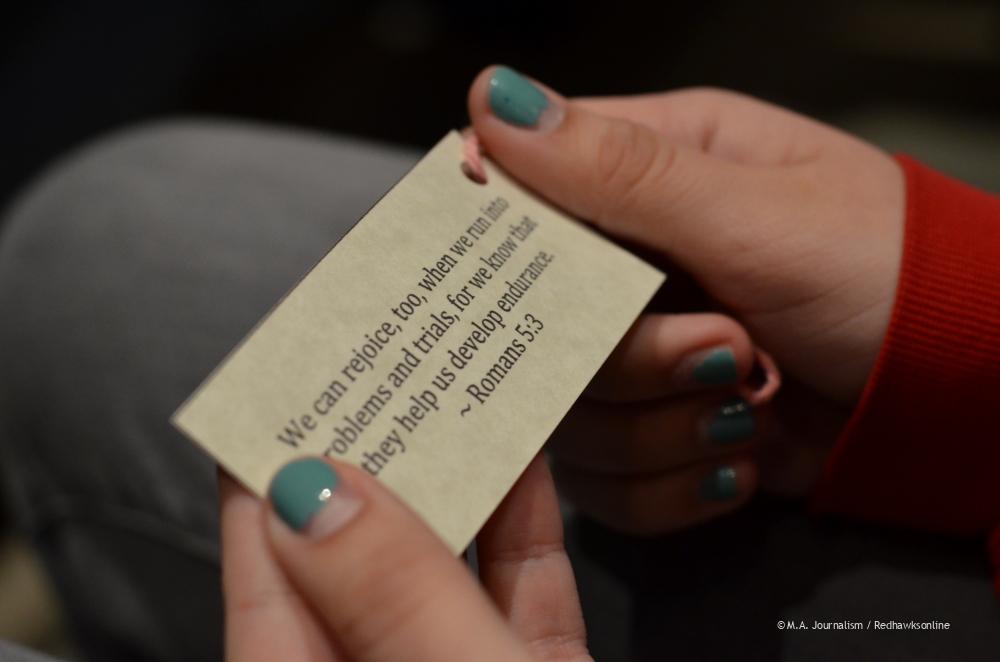 Verse cards are received by students and faculty during chapel. Photo by Maddie Binning.