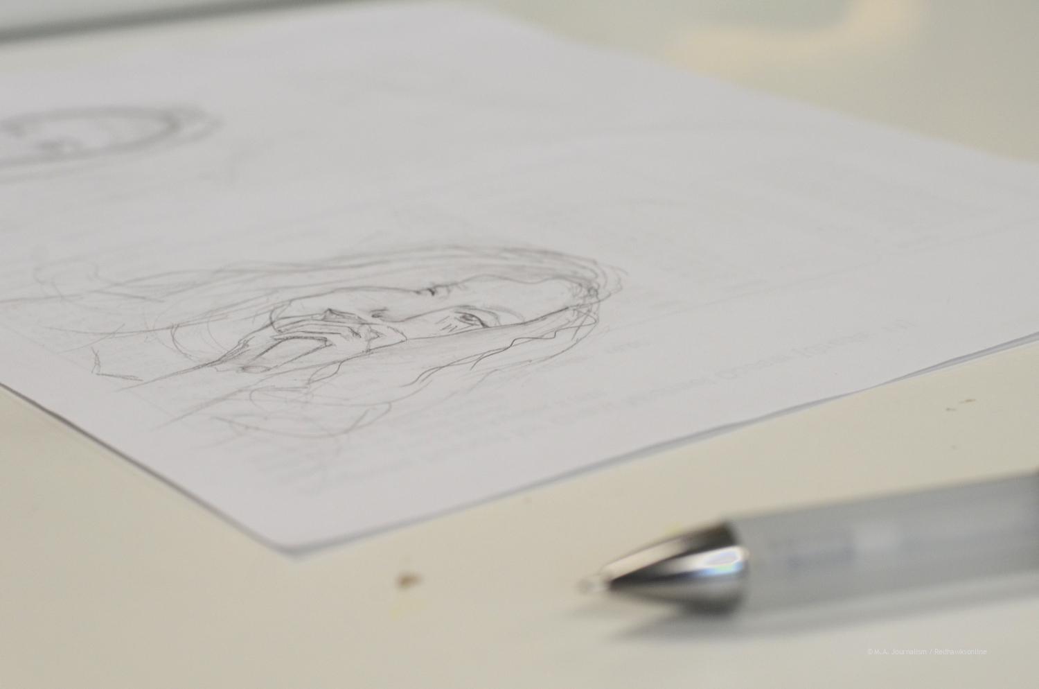 A students sketches on the back of their assignment during class. Photo by Maddie Binning.