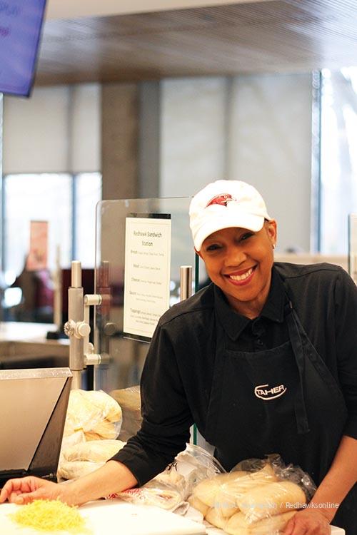 Nance Murdock at the sandwich station of Taher food service at Minnehaha Academy upper school. Photo by Cana Schimelpfenig.