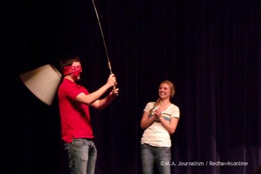 Centennial interns call students to the stage to participate in a challenge during assembly. Photo by Maddie Binning.