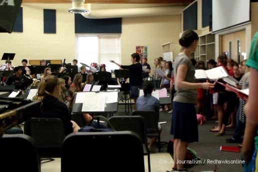 The band and choir rehearse for the upcoming graduation ceremony. Photo by Maddie Binning.