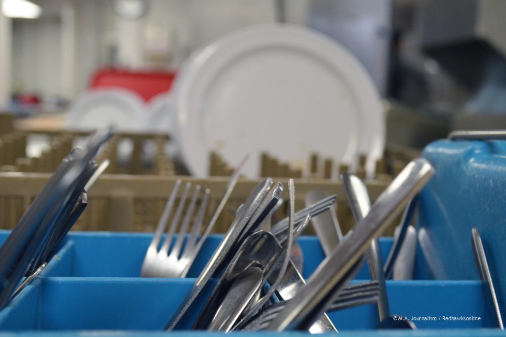 Dirty dishes fill the back window of the kitchen as lunch comes to an end. Photo by Maddie Binning.