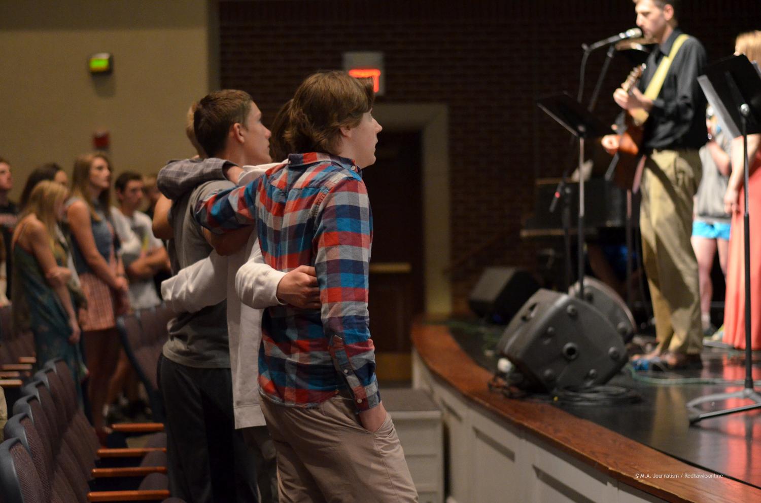 Senior boys put their arms around each other during the last song of their final chapel. Photo by Maddie Binning.
