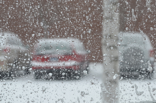 Winter weather fills the parking lot and the roads with wet snow, complicating commutes. Photo by Maddie Binning.